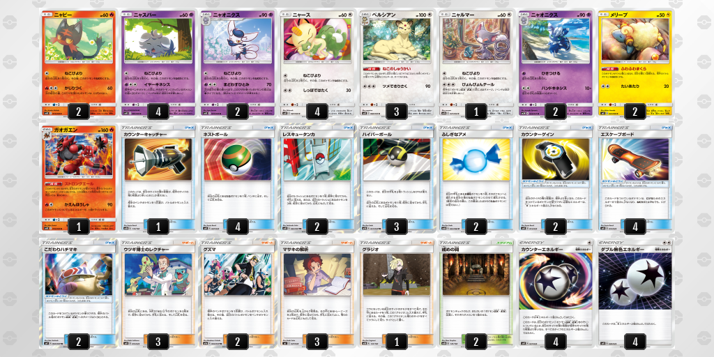 ポケモンカードゲーム サン&ムーンシリーズの拡張パック ダブルブレイズ(sm10)のシングルカードをインターネットで通信販売しています。 (Page 1) ダブルブレイズ収録のベトベトンタッグチームデッキのレシピと解説を丁寧に画像つきで掲載。 ダブルブレイズ ポケカデッキ解説 安くて強いデッキ大好き!管理人のインゲンです! 今回は「ダブルブレイズ」でまさかの強化を受けた「 ねこびより 」のポケモンが大活躍のデッキ! 安い、かわいい、強い、の3拍子揃った吉野家みたいなデッキです(?)。 ねこ好きならたまらない!