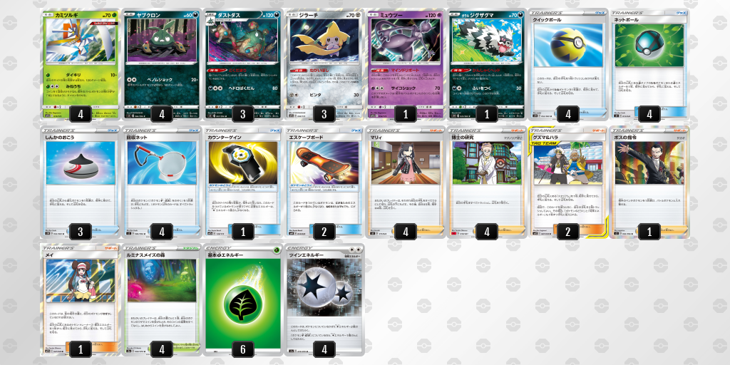 ダストダス vmax デッキ- 「Mミュウツー ダストダス」 デッキに注目して書いていきました。 このデッキでチャンピオンズリーグに出ようと思っていたのである程度の考察はしていったつもりでしたが ルール変更などにより、残念ながらチェンジをすることになりました。 唯一の《ダストダス デッキにおいて"この60枚が正しいというものはなく"、いろいろ試してみることが大切だと思います。その日の60枚が明日もそのまま強いとは限らないのもカードゲームの醍醐味になります。 流行っているデッキに合わせて入れてみるカードを試行錯誤していくと